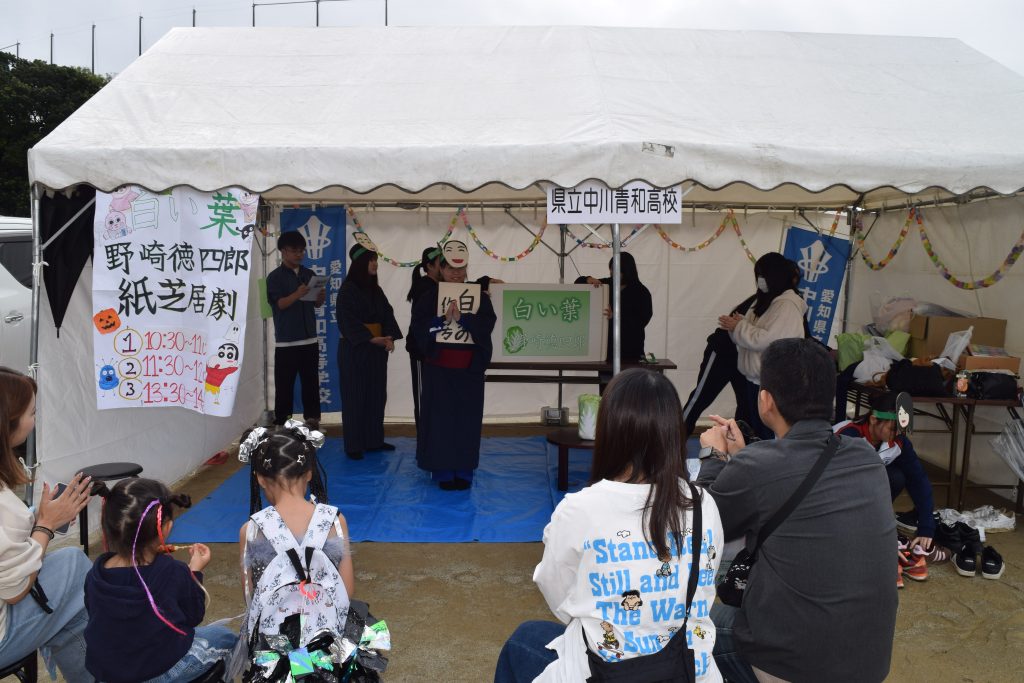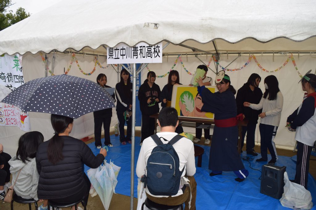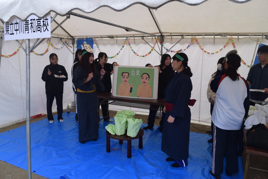 令和7年10月26日(日)露橋公園で行われた「令和7年度 中川区区民まつり」に、3年次生課題研究「エリアビジネスプロジェクト」のメンバーが参加しました。中川区発祥の伝統野菜「野崎白菜」の紙芝居劇を中心に地域の方々と交流しました。雨の中でも積極的に呼び込みを行い、中川青和高校の生徒が活躍しました。