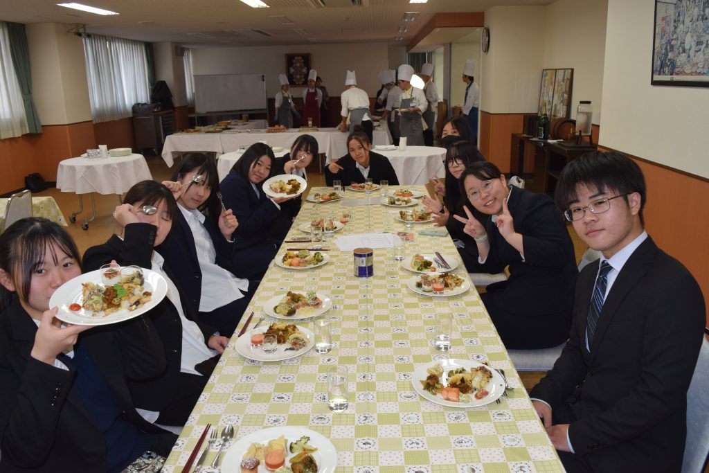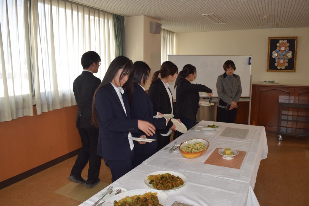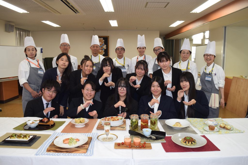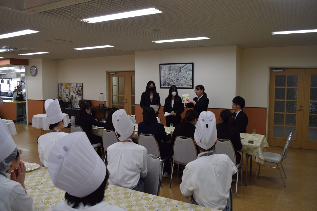 令和7年11月21日(金)3年次生課題研究「エリアビジネスプロジェクト」講座のメンバーが、名古屋調理師専門学校で行われた試食会に参加しました。今年度は野崎白菜、miuトマト、ブロッコリーの地元野菜を活用した料理レシピを共同で開発しています。本校は主にレシピのイラストのデザイン、レシピのタイトル考案、野崎白菜等の説明文を考えています。具体的なレシピの内容は専門学校で考案され、今回の試食会が実現しました。専門学校の学生の方々とも交流することができました。料理のレシピの完成が待ち遠しいです。