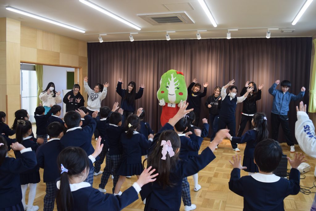 令和7年12月3日(水)五反田幼稚園にて、3年次生課題研究「エリアビジネスプロジェクト」のメンバーが出前授業を行いました。野崎白菜誕生の紙芝居と、はくちゃんダンスを園児たちと一緒に踊りました。園児たちはとても喜んでくれて、私たちも嬉しい気持ちになりました。野崎白菜の伝統を伝えるとともに、素敵な時間を過ごすことができました。